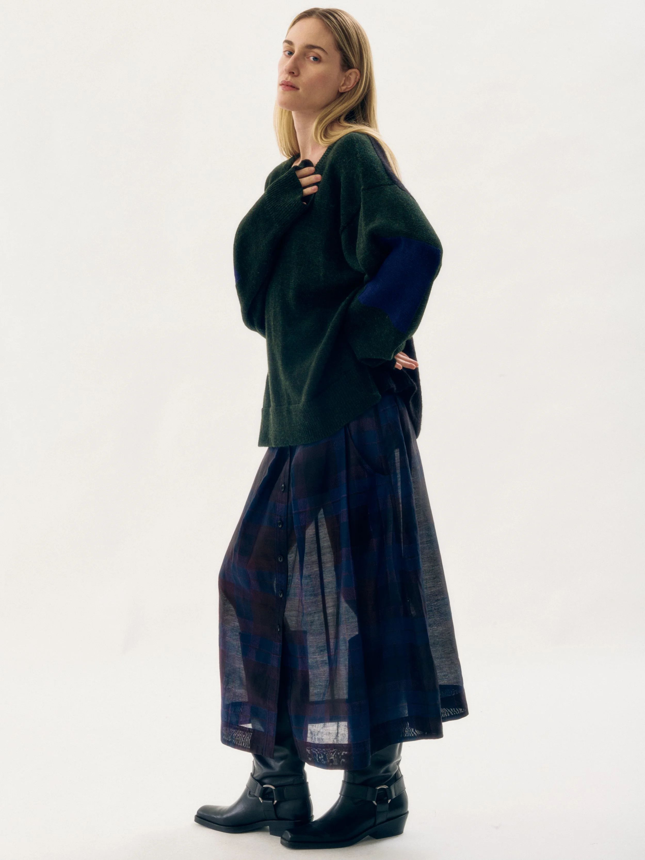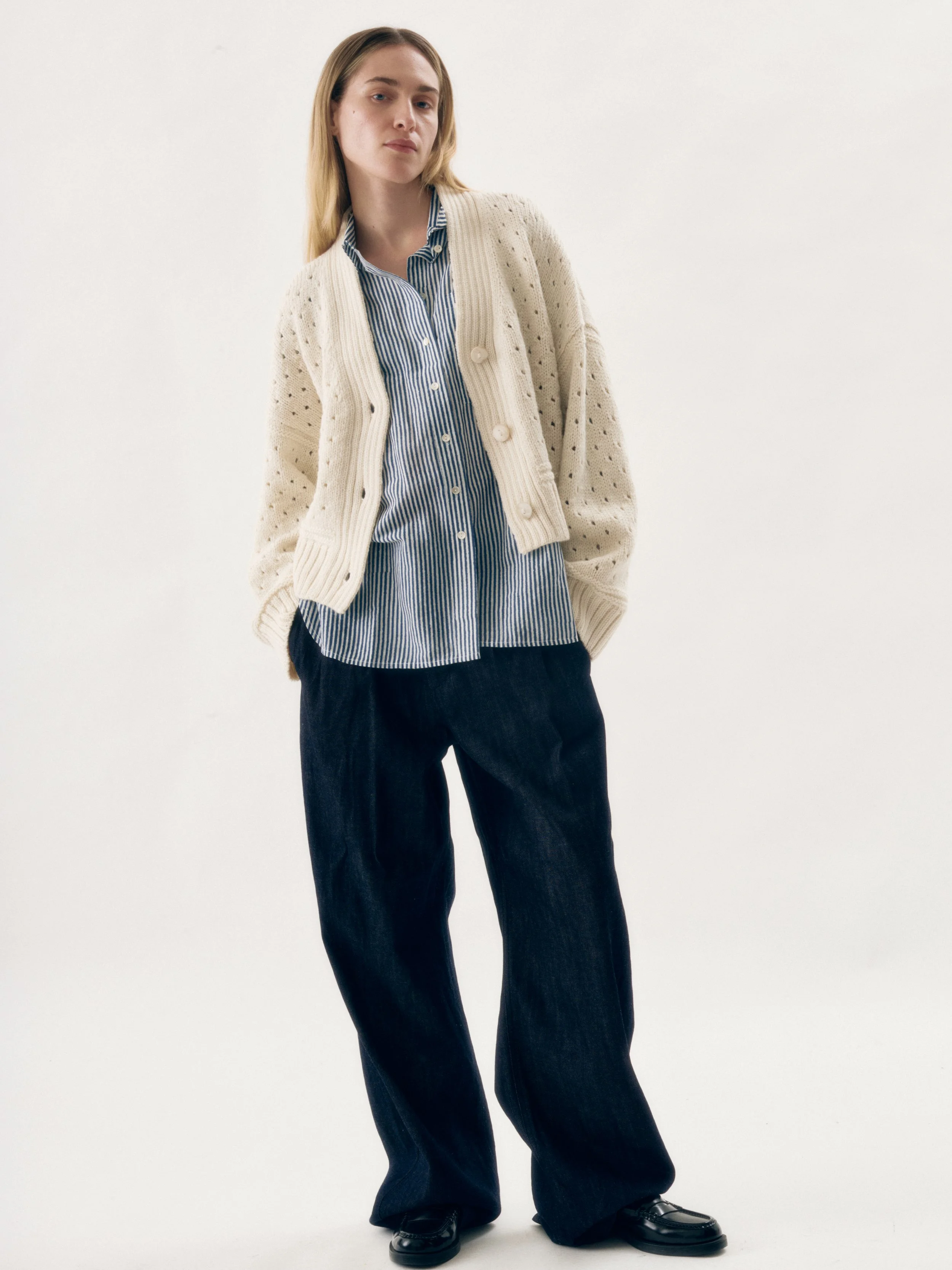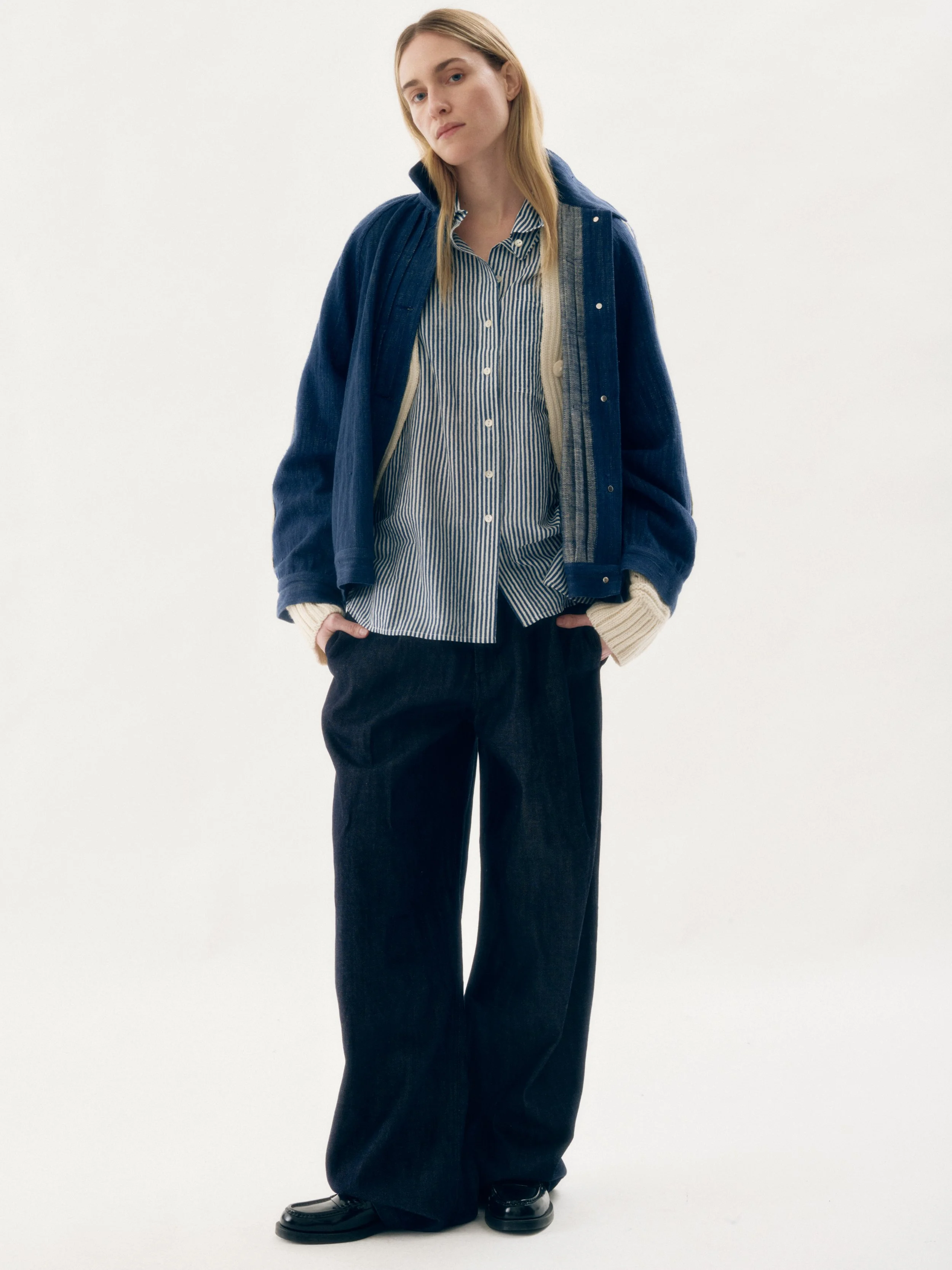 This silhouette is a part of our new basic essentials. A classic bib front tuxedo shirt with a cropped body , band collar, mother of pearl button front and soft shirring detail at the back yoke. Made in our signature hand weaved silk cotton. We love working in this fabric as it has a soft sheen and transparency , giving it a more elevated look that can easily be dressed up and down.