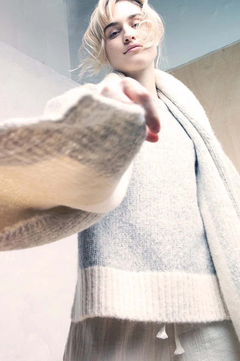 The together sweatshirt for this fall is made in a double sided cotton gauze with a soft cream side and a heather bluegrey tone on the revers side . This fully reversible style is lightly quilted and embroidered in a subtle plaid pattern . the fill and padded feel of this fabric is made by the embroidery threads that run in-between the layers of gauze. The cream side of this garment is trimmed with natural undyed kala cotton at both neckline and sleeve hem . The together sweatshirt is inspired by a classic sweatshirt silhouette , it has a raglan sleeve with a raw edge trim , a boxy slightly cropped body and a relaxed neckline .