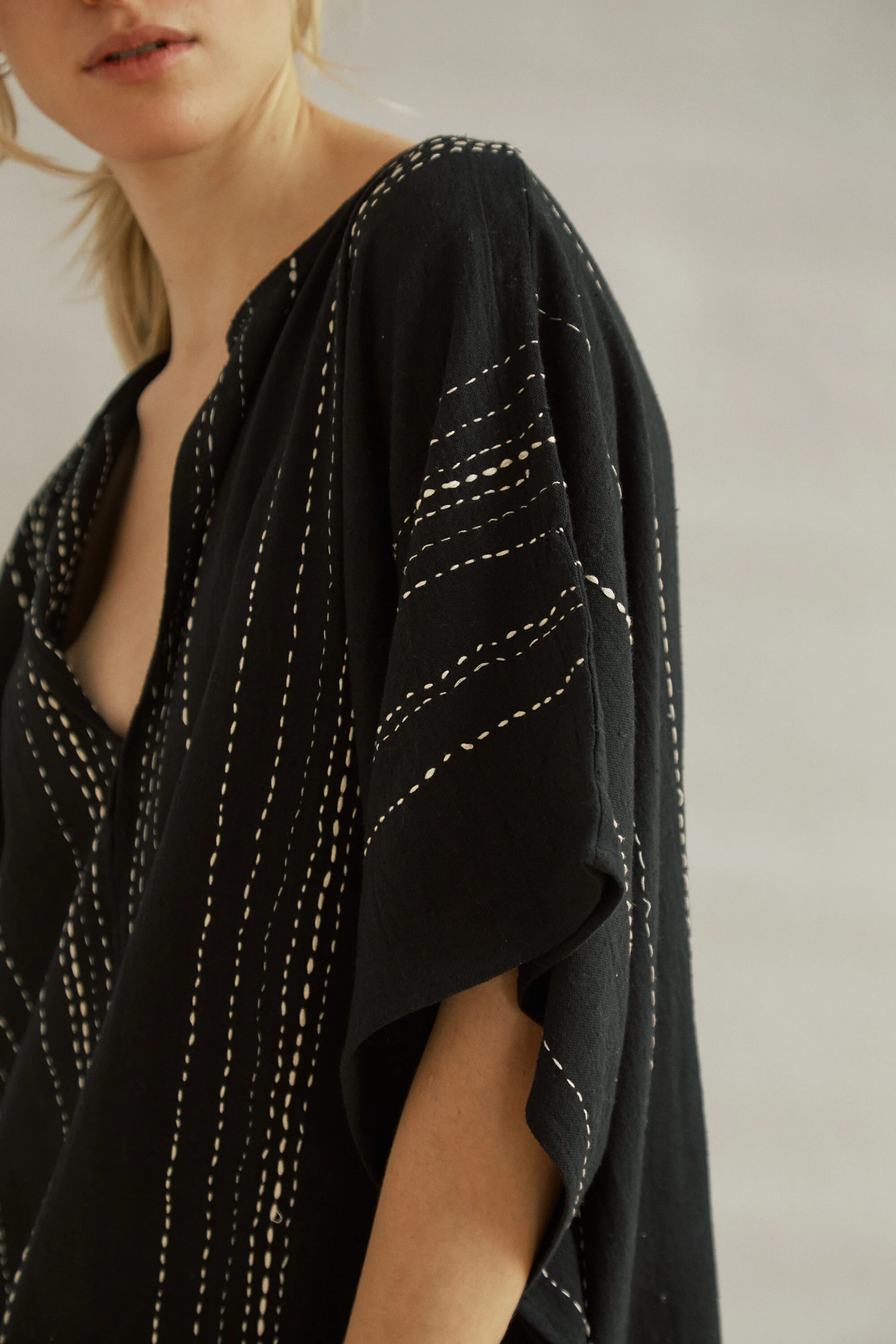 The Relax Kaftan is cut here in our handwoven kala cotton, which has been naturally dyed to a deep, rich black with iron. The entire piece is then hand embroidered with natural, undyed thread in a beautiful variegated stripe pattern.